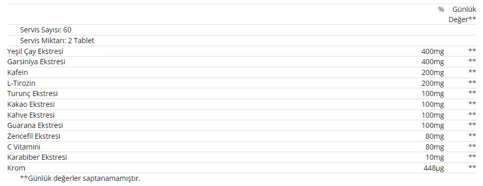 30 ml likit içeren tüpler içerisinde satışa sunulan karnitin shot ayrıca porsiyon başı 100 mg Caffein, 300 mg Taurin ve Vitamin B6 içermektedir.